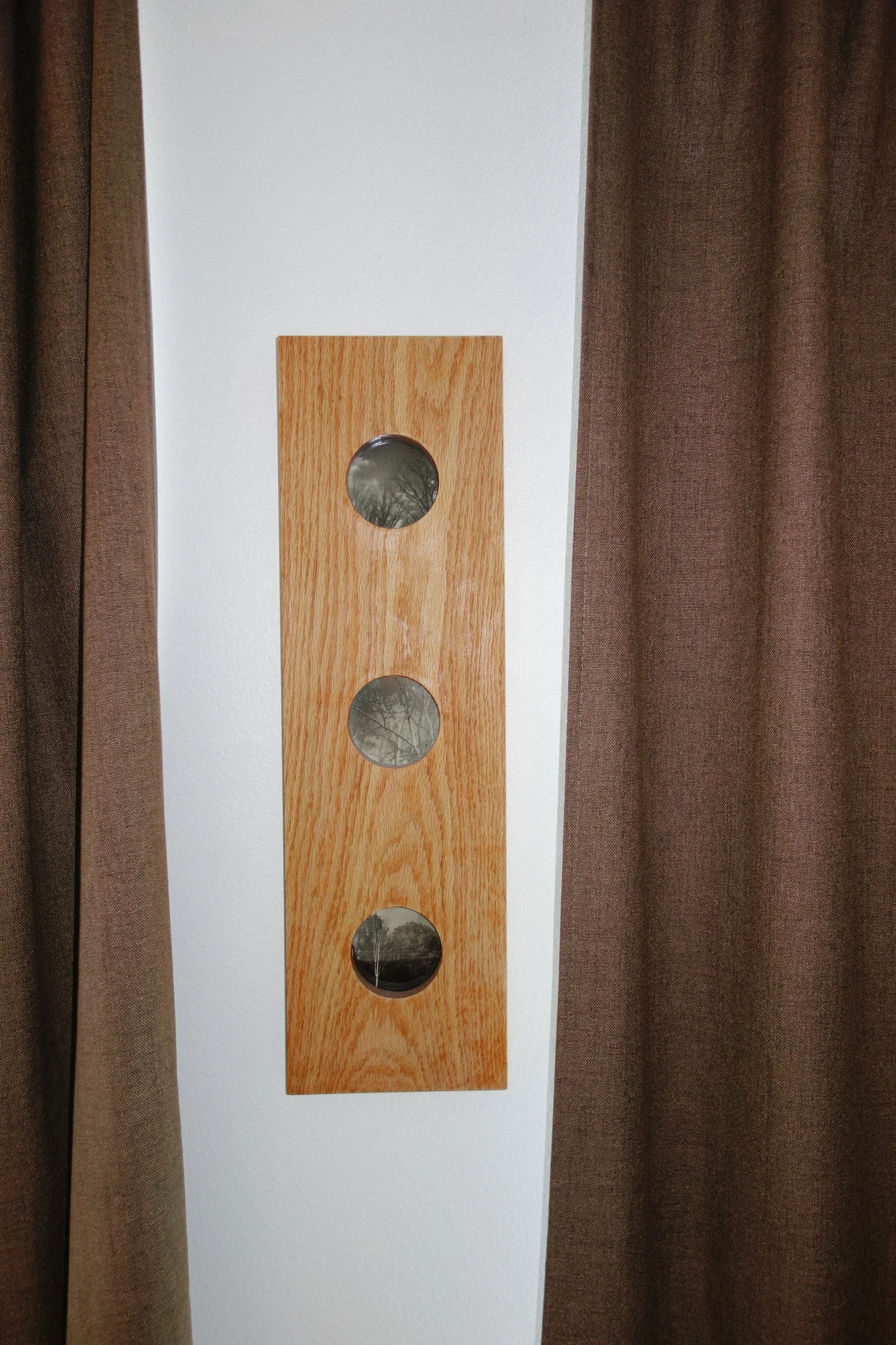 8x24in frame with three circular cut outs and three 4x6in openings on the back. 2024